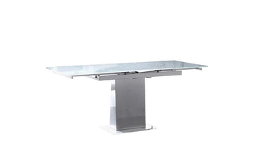 Bonn Dining Table White- 10mm tempered, frosted glass top. Metal and engineered wood framework. Choice of finish option. 2 built-in leaves add 31 in.. Seats 6 to 8 or more with leaves. Single pedestal base. Includes 1-year manufacturer's warranty. Sleek style and hospitality meet in this Bellini Modern Living Bonn Extendable Dining Table. This dining table features an angular, metal pedestal base available in your choice of finish color. It's topped withning table features an angular, metal pedestal base available in your choice of finish color. It's topped with tempered, frosted glass that enhances the contemporary vibe. Two built-in butterfly leaves extend the table to a generous 102 inches. This allows you to seat between six to eight or more guests. Available also in Sand Brown color.