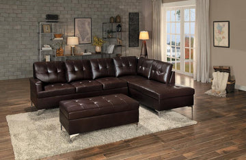 Soft Contemporary styling lends a cool, classic look to your modern living space in the Brenton Collection. Stitch tufting provides soft contrast to the cleanly designed lines of this seating arrangement. The attached chaise lounge and accompanying ottoman provide the opportunity for putting your feet up while you enjoy your downtime. The seating group is offered in Gray, black and brown bi-cast vinyl.