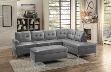 Soft Contemporary styling lends a cool, classic look to your modern living space in the Brenton Collection. Stitch tufting provides soft contrast to the cleanly designed lines of this seating arrangement. The attached chaise lounge and accompanying ottoman provide the opportunity for putting your feet up while you enjoy your downtime. The seating group is offered in Gray, black and brown bi-cast vinyl.