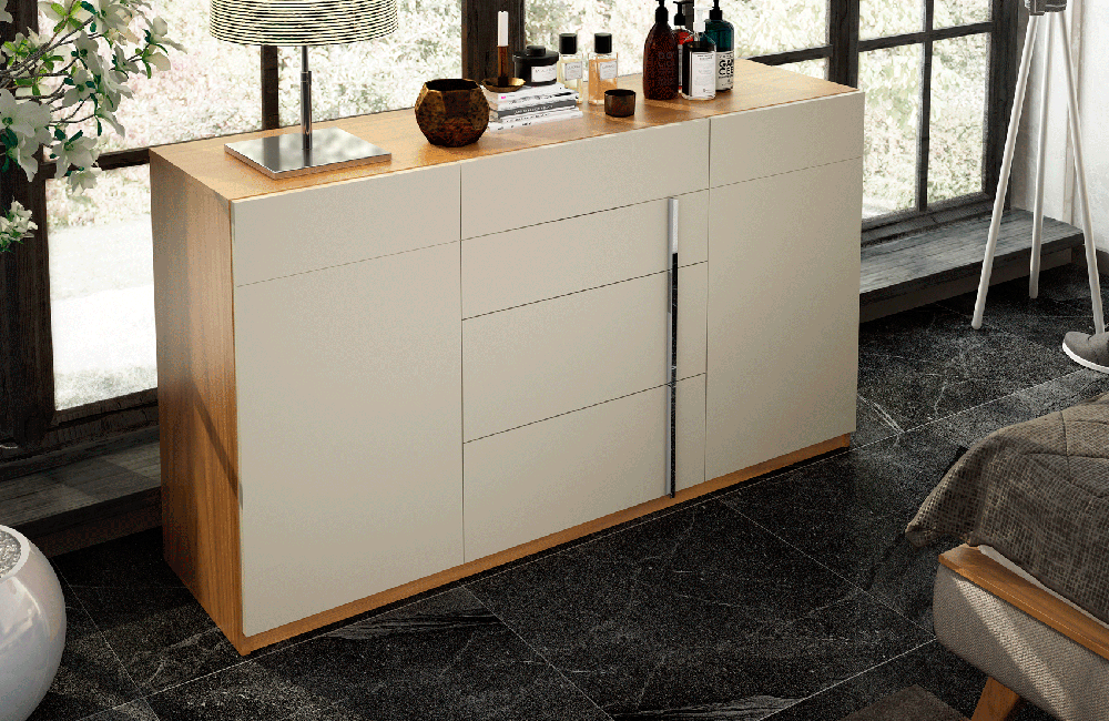 Finishes: MATT ARENA LACQUER & NOGAL NATURAL WOOD VENEER / FABRIC OKIOS CREMA