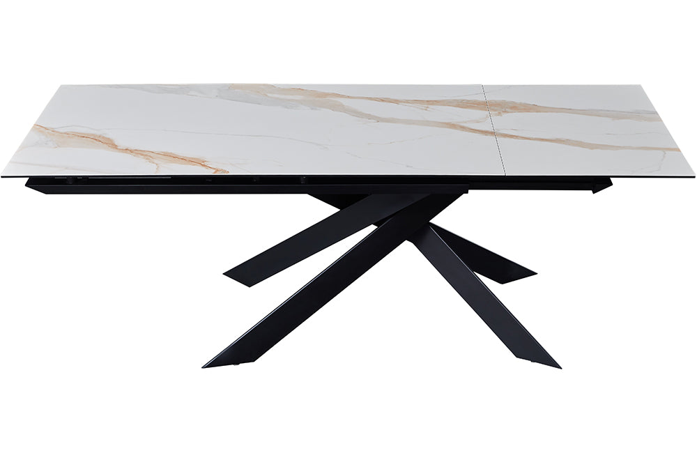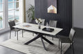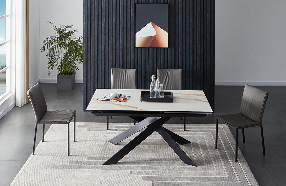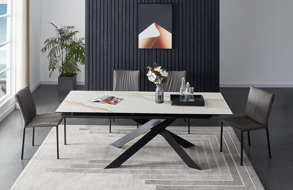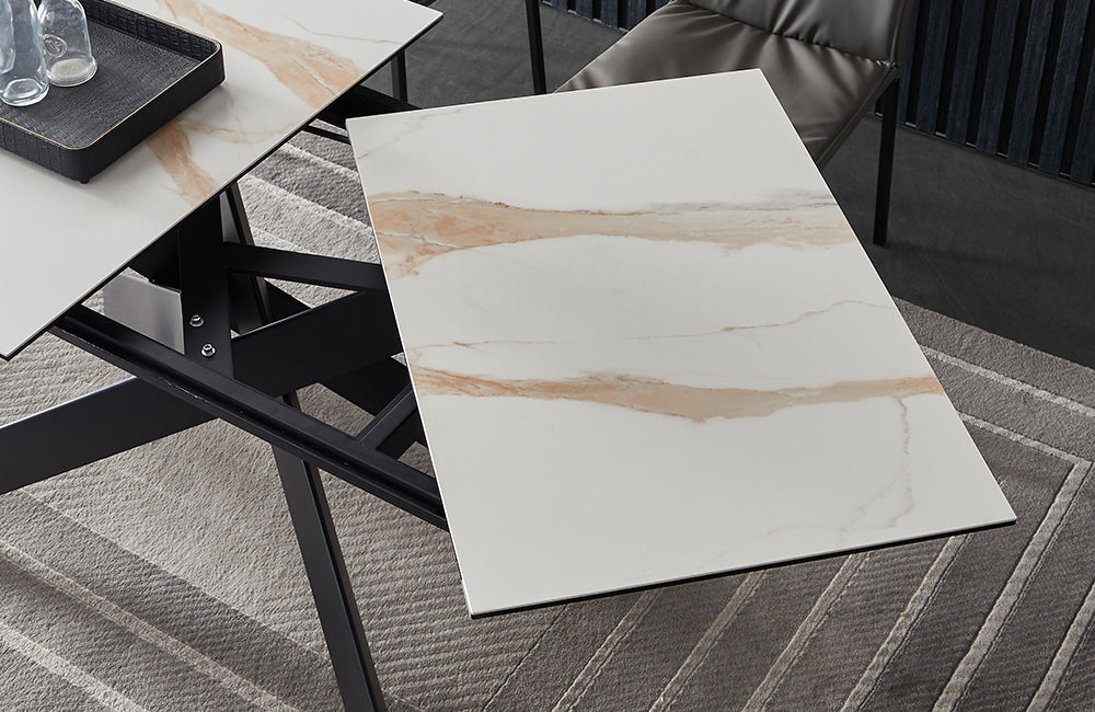 We at Paramus Furniture are proud to introduce the newest addition to our Modern Dining Collection. The Calcutta Extension Table top is crafted out of a durable and luxurious matte ceramic, and accentuated by the sophisticated black powder coated aluminum legs. The Calcutta is our first ever extension table featuring a simple to use swing out mechanism, allowing this table to accommodate larger groups. This table is perfect for those who like to entertain, but want to maintain a smaller footprint in the home when not in use.