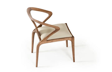The Campbell Dining Chair presents an arresting design featuring a Walnut finished solid wood frame upholstered in beige leatherette. It features uniquely designed armrests that that look like a flexed arm.