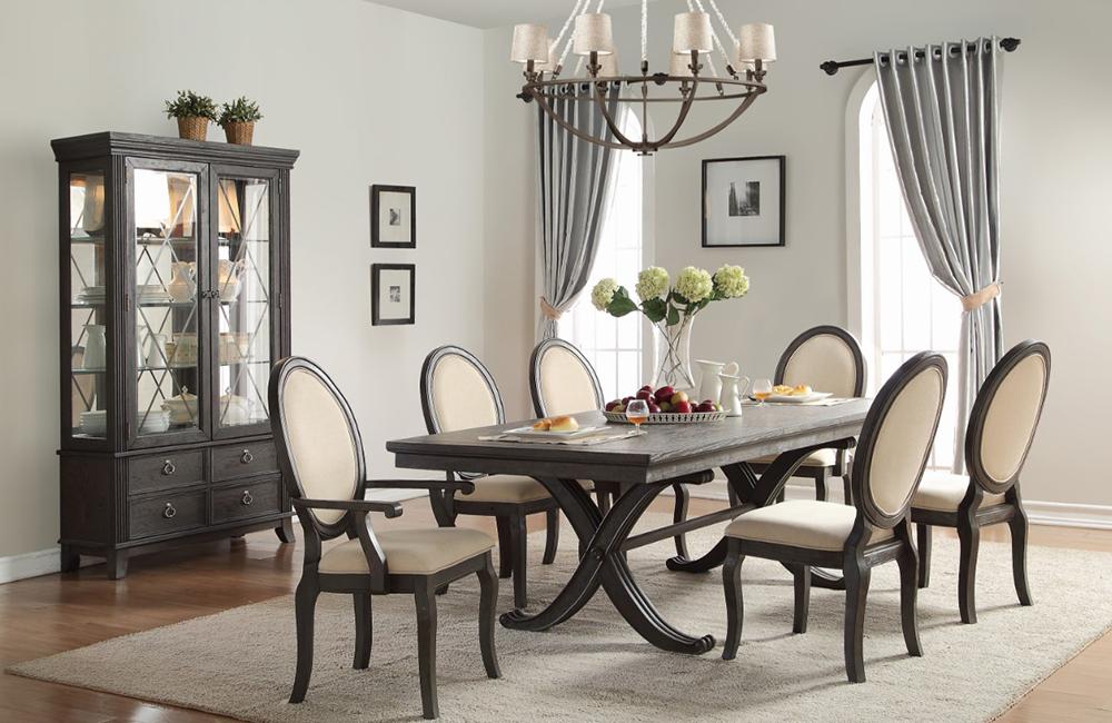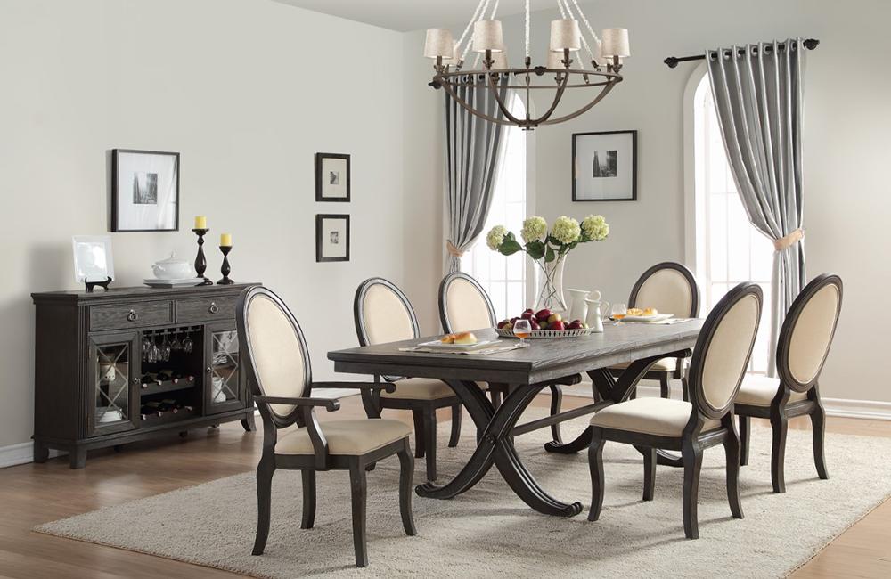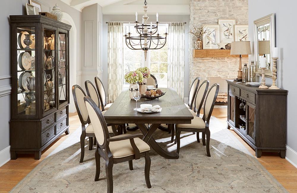 With styling that exemplifies traditional design, the Canavese Collection exudes sophistication and refined elegance. Cantered pilasters frame the serpentine fronted china and server, while egg and dart molding, acanthus leaf motif and bale, and button hardware lend to the traditional look of all pieces. Burl inlay creates beautiful contrast to the gold-highlighted cherry finish of the collection. Two table options provide flexibility for placement in your dining space – the first, a 110-inch double pedestal base rectangular top table, the second, a 76-inch oval top single pedestal base table. Button-tufted traditional tweed fabric features prominently on the accompanying wood-framed chairs.
