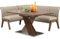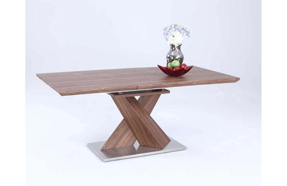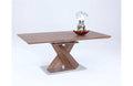Bethany collection walnut dining table top with walnut "X" shape pedestal and brushed stainless steel base