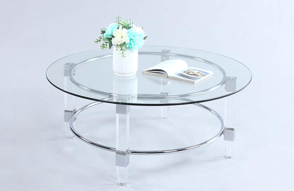 This splendid, thoroughly modern coffee table would make a great addition to any contemporary styled living room. The round, tempered glass top infuses the piece with an elegant sensibility, which the metal acrylic legs support and sustain to ensure that your living room environment can really come to life.