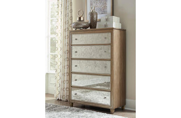Your personal style will be reflected with the addition of the Carly Collection to your bedroom. Antiqued mirror panels cover the headboard, footboard and drawer fronts of each case piece, highlighting the light oak finish over oak veneer of the collection. Knob hardware provides an unobtrusive break to the clean lines of each case piece.