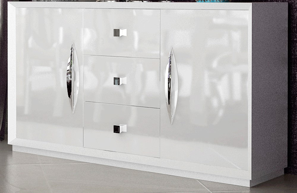 European Dining Set In Clean White Color. High Gloss Finish. Available as Dining Table with extension , side and arm chairs , China ,Buffet and Mirror.