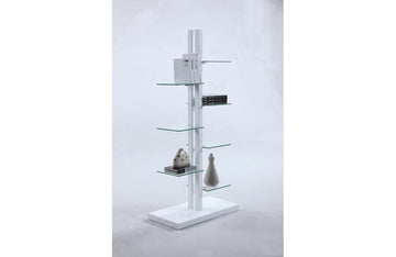 Featuring seven clear glass shelves and a glossy white central pole made from metal and wood. It's a shoe-in for any modern styled home