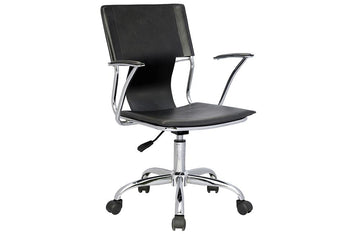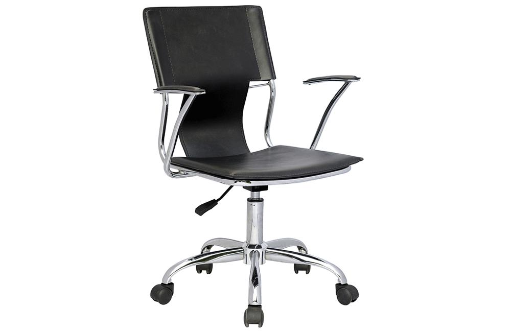 Modern pneumatic gas lift adjustable swivel computer chair. 5 Star chrome base/footrest. Chrome arms. Available in White PVC.