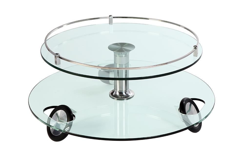 Motion two tier round castered stationary cocktail table, Rotating tempered glass top tier Chrome supporter, Glass base is tempered, Casters are stationary,