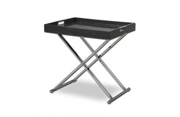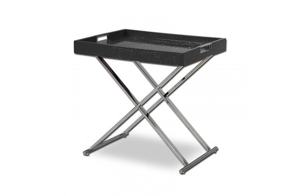 Place the Cecilia tray next to your bed or sectional to serve as a handy tray table. The “X-shaped” tray table features stainless steel legs and a detailed laser-cut crocodile textured surface covered in a semi gloss lacquer. Available also in red.