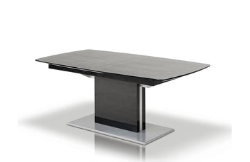 A solid aluminum base supports the Centro dining table. The table top is crocodile textured with a detailed twelve step laser-cut process. It is then treated with a durable black semi gloss lacquer top coat. Matching aluminum accents trim the sides of the Centro. Provide additional room for guests by using the butterfly extension. Also available in white.