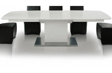 A solid aluminum base supports the Centro dining table. The table top is crocodile textured with a detailed twelve step laser-cut process. It is then treated with a durable white semi gloss lacquer top coat. Matching aluminum accents trim the sides of the Centro. Provide additional room for guests by using the butterfly extension. Also available in black.