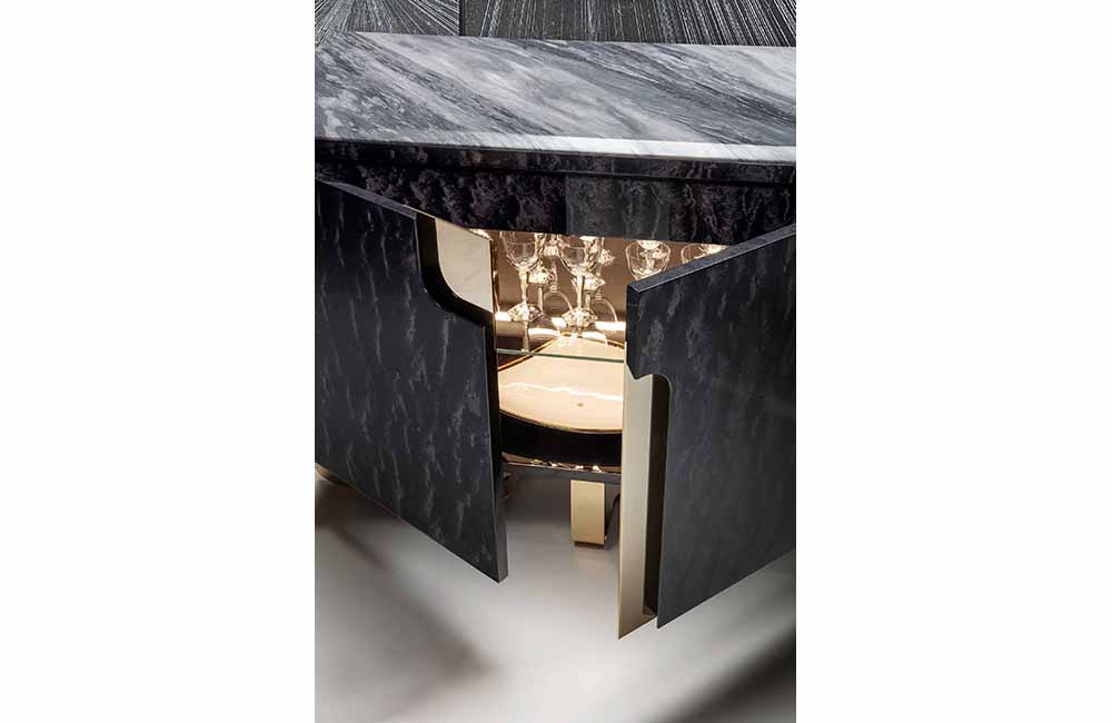 Top in beveled marble. Base, handles and details in light gold chrome stainless steel.