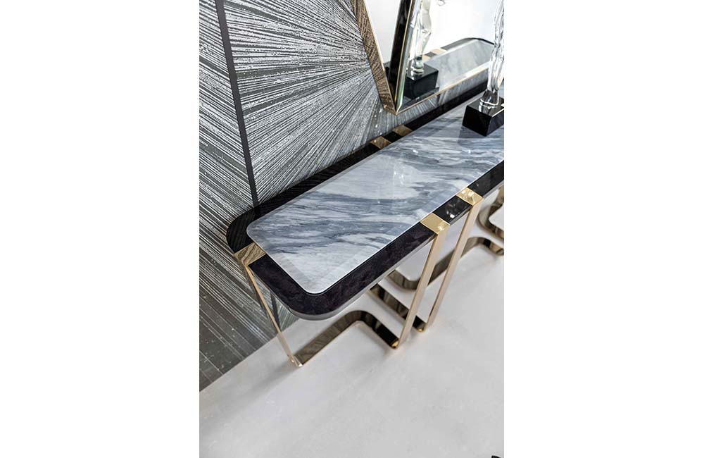Console in Black Bubinga burl veneer with high gloss polyester finish.Top in beveled marble.