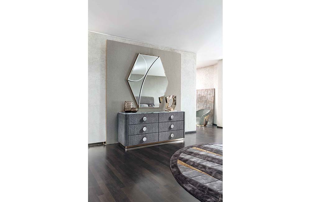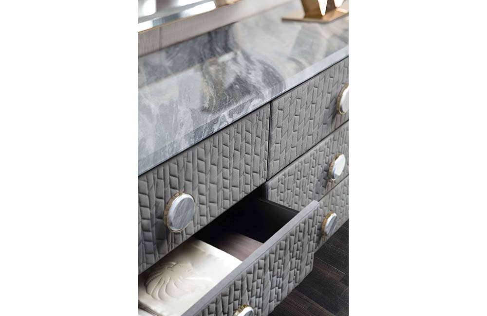 Dresser in quilted grey nubuk color nr 6 with top in beveled marble.