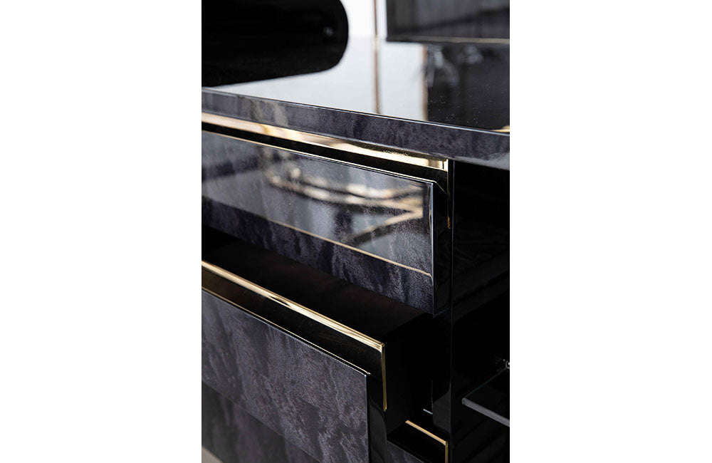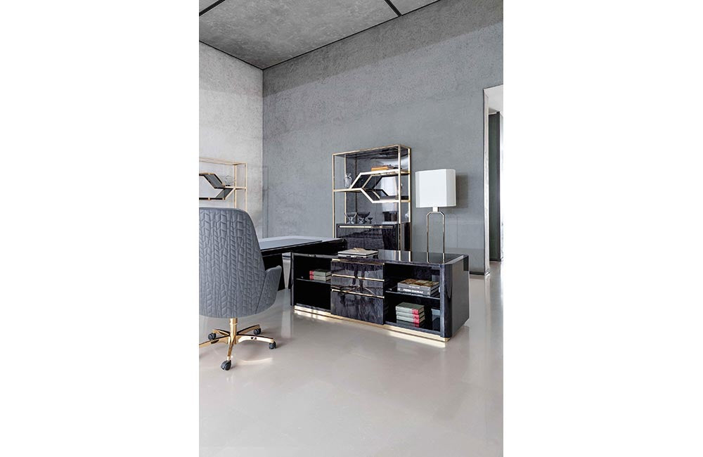Return for desk on wheels in Black Bubinga burl veneer with high gloss polyester finish.