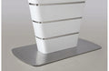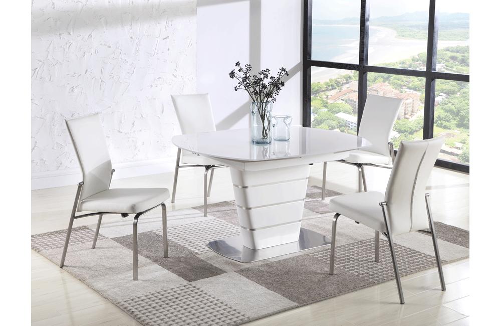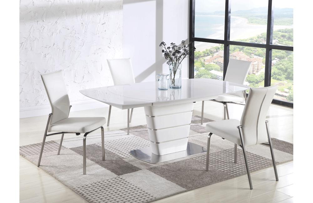 The Dorotea dining table is a stunning modern silhouette. This table offers both function and style in one package. The table top swivels to activate the extension leaves. Its 10mm pure white tempered glass top and brushed stainless steel base are sleek additions to the modern design.