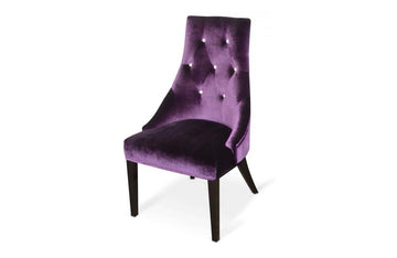 The Charlotte chair is upholstered in a soft velour fabric and enhanced by crystal tufts and quality stitching. High gloss black legs slightly curve outward to create movement in the design. Available also in black and gray velour.