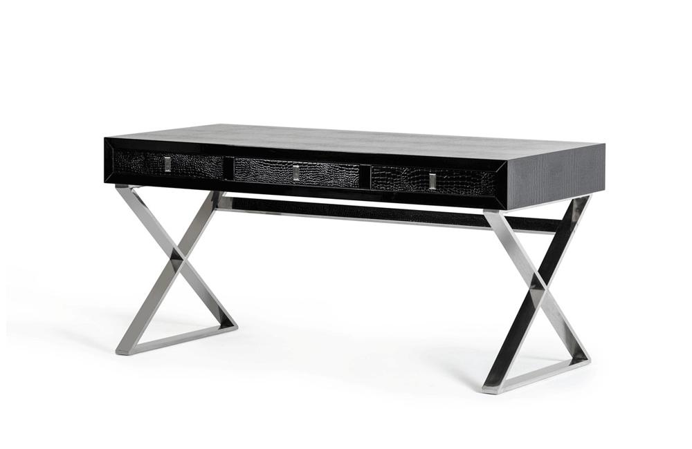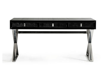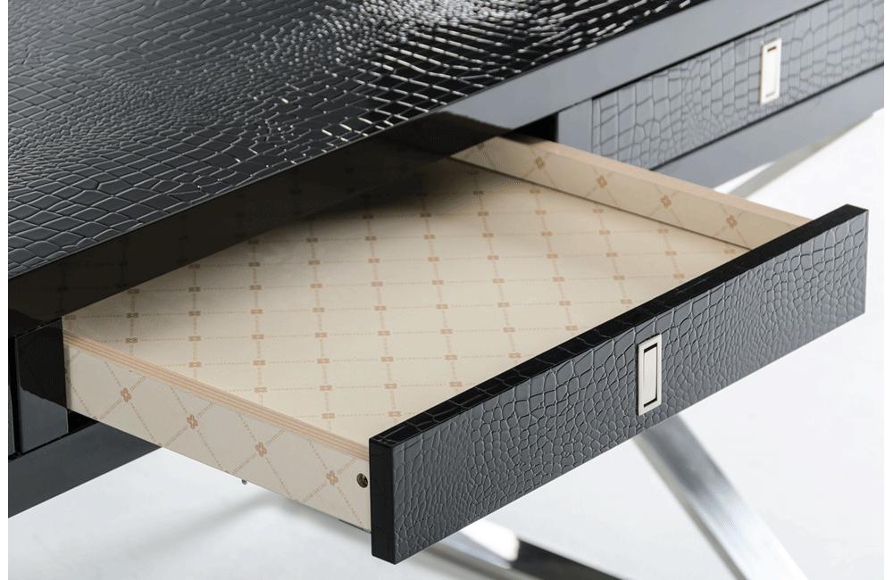A detailed laser-cut crocodile textured pattern covers the framework of the Congress desk. The frame is then polished with a rich black lacquer to create a glistening effect. Features three storage drawers and contemporary “X-shaped” stainless steel legs. Also available in white and red.