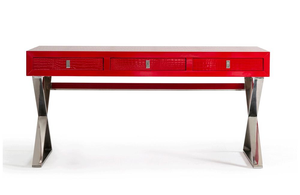 A detailed laser-cut crocodile textured pattern covers the framework of the Congress desk. The frame is then polished with a rich black lacquer to create a glistening effect. Features three storage drawers and contemporary “X-shaped” stainless steel legs. Also available in Black and White.