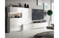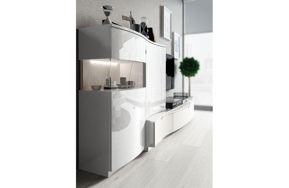 *All is white high gloss except for the front of the drawers low modules and the inside of the glass section with light which is in oak wood veneer Decapé (which is a white wash, the brownish colour is from the wood grain)