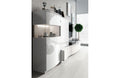 "L" inverted unit has two doors, one big from top to floor with glass insert and lighting and the smaller door on the right which sits on top of the low modules.