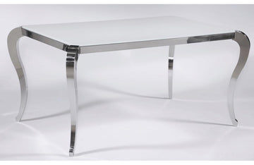 Modern Starphire Glass White Dining Table with Polished Stainless Steel legs. Glass top is Tempered.