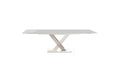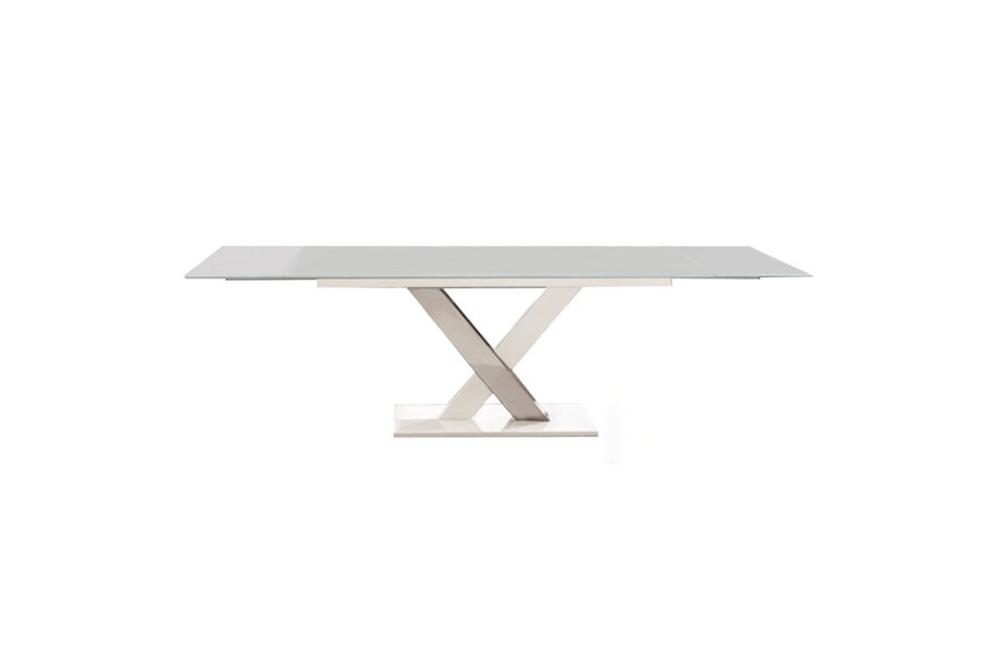 X marks the spot with this elegant extension dining table. 12mm tempered crystal glass with high gloss & stainless steel legs that cross in the center, forming an “x”. Elegant design, beautiful finishes and a perfect size with capabilities for extension accommodate all to your dinner guests.