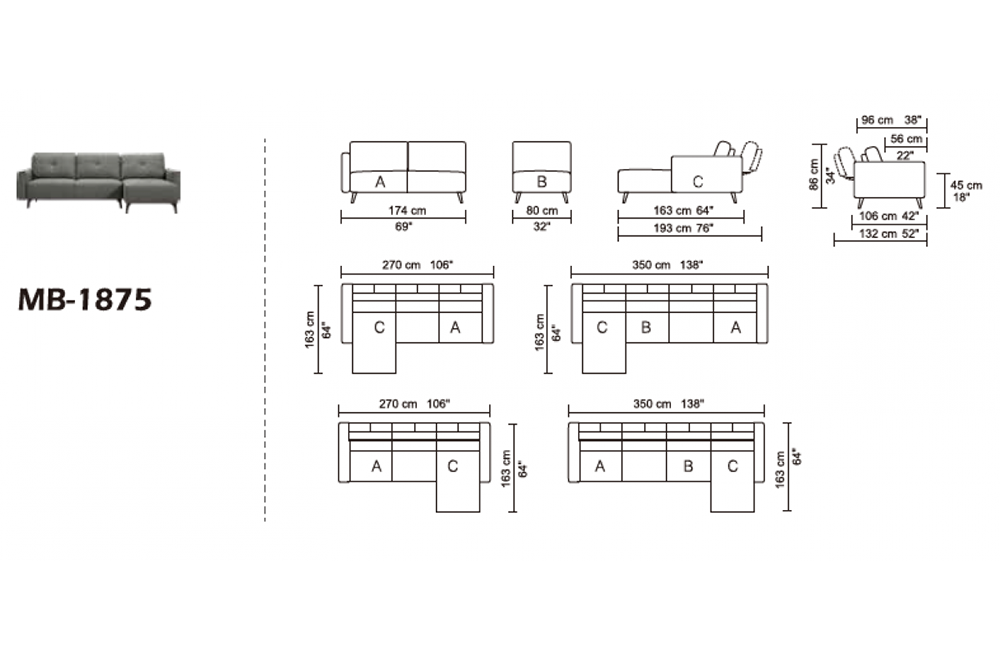 - Armless Seat: W32" x D42/52" x H34"