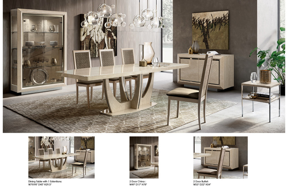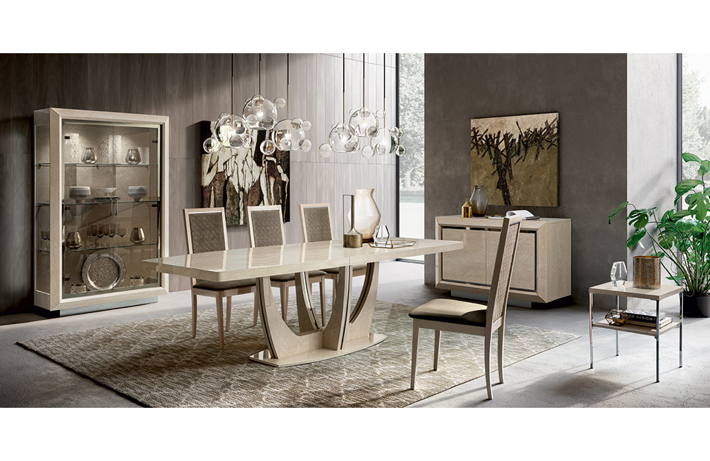 Elegant Dining room furniture with an extendable table in Ivory soft color. Ambra Table and Rombi chairs.