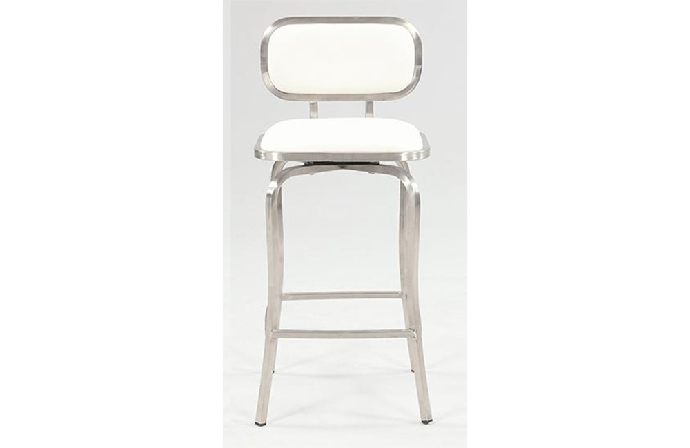 Modern style swivel stool. Available in Counter Height or Bar Height. It has a brushed stainless steel finish. Your choice of Black or White PU cushioned seat and back.