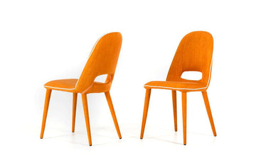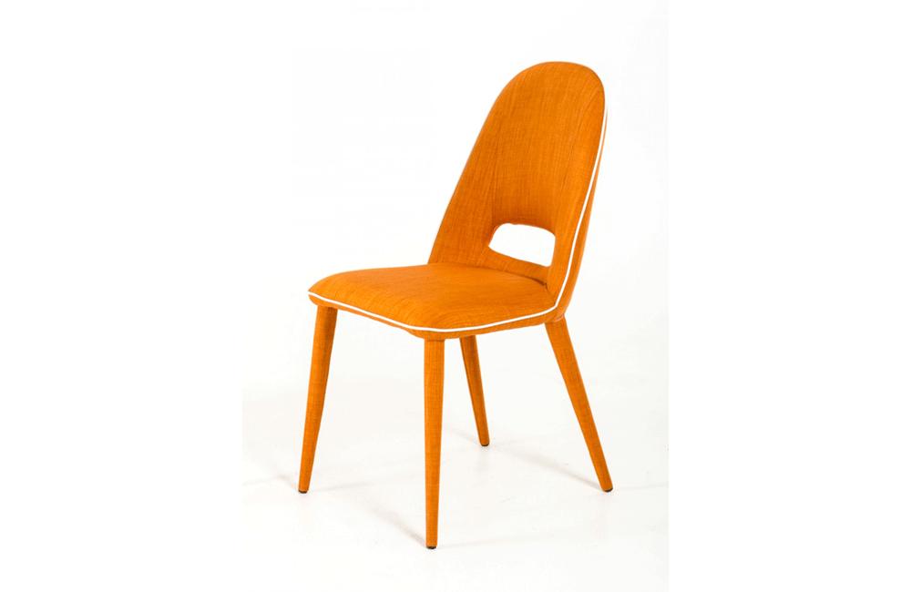 The Eugene modern orange fabric dining chair is a class in its own featuring tapered, fabric covered metal legs and orange fabric upholstery. White piping provides an excellent contrast to the backrest and seat. This modern orange fabric dining chair also features an "opening" at the backrest near the seat for ventilation.