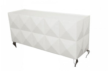 The Eva White lacquer 3-door buffet exhibits an elite style featuring pyramid block patterns on the cabinet doors. This buffet is polished in high gloss White lacquer and fitted with three cabinets. Transitional style leg design in stainless steel provides a classy touch to its overall appeal. Available also in Black gloss.