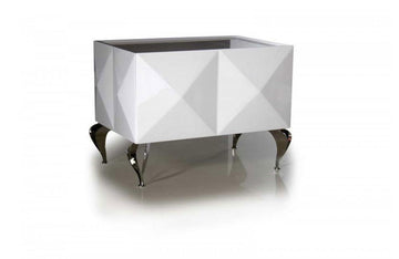 The Eva white nightstand is gorgeously designed with huge lacquer patterned pyramid blocks on the sides with a white polish lacquer top providing a beautiful contrast to its total appeal. Transitional stainless steel legs added a touch of elegance with its interesting bowed design.