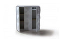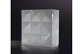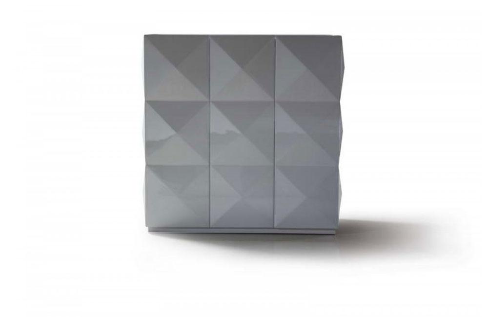 The Eva white cabinet features a three by three matrix lacquered patterned pyramid blocks in the front and side panels that presented an ultra-modern design. Offering an effective storage solution are the right and left panels that open up to reveal shelves of different heights, with the right panel fitted with a pull out compartment. The middle panel is left in place.