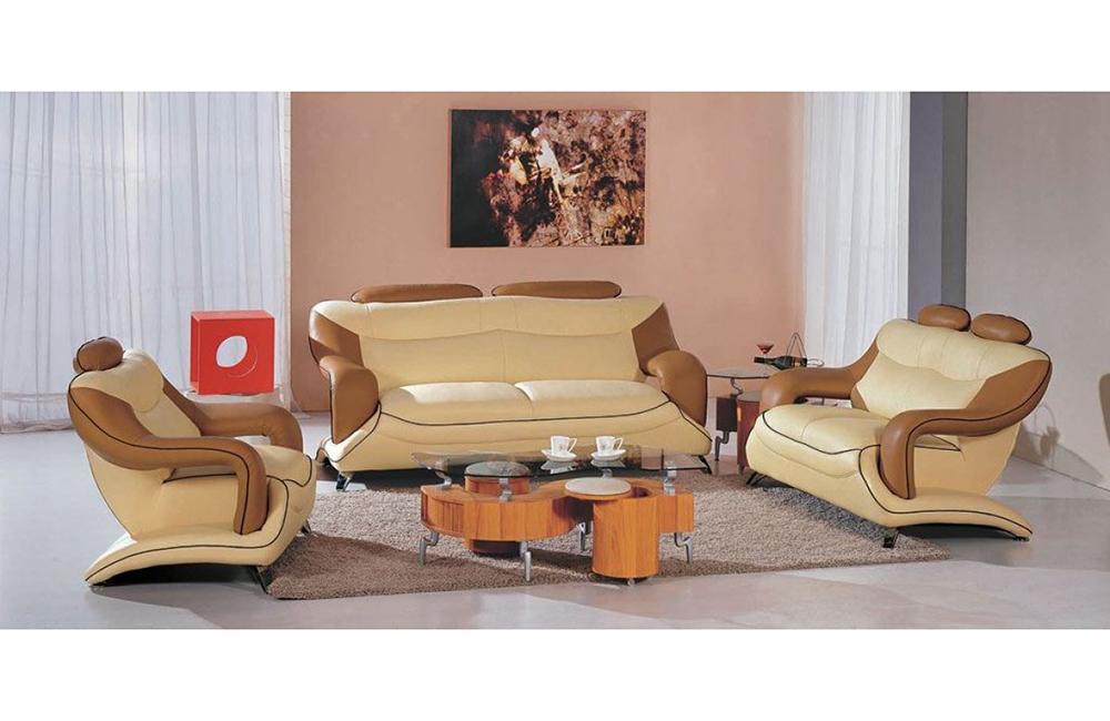 Elegant contemporary genuine cream/camel bonded leather 3-pieces sofa set. Living room set available in cream/camel color. Living Room Set made from high quality bonded leather, and chrome legs. It's modern design and high quality of construction have proven to be very popular among our consumers. An excellent choice for people with sophisticated style and strong character. All of the seats and backs are high density (1.9) foam to give comfort and support. Only solid hardwood products are used in the frame construction. All corners are "blocked", nailed, and glued for strength and durability. Set includes Sofa, Loveseat, Chair.
