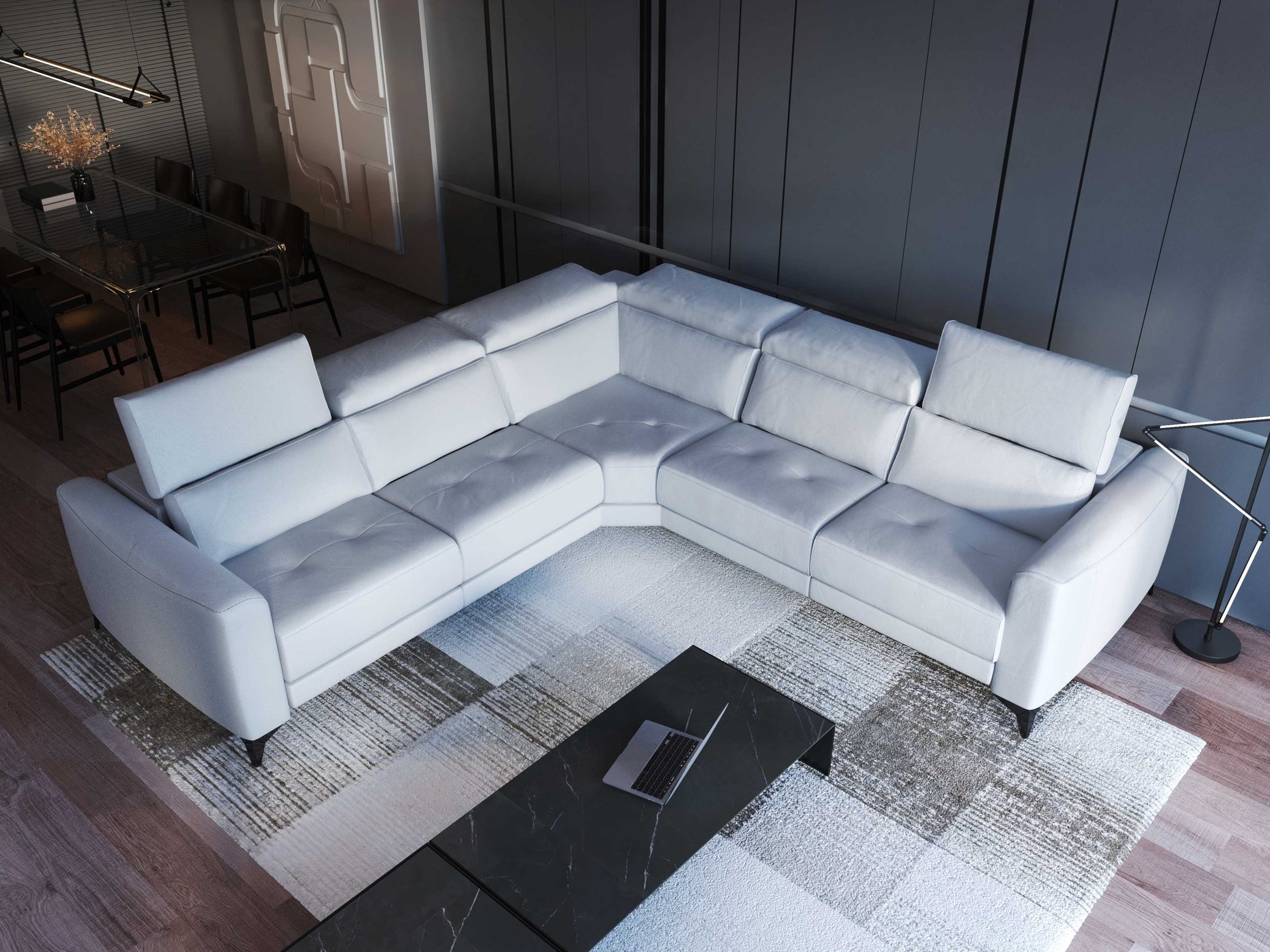 Ferarra white leather sectional L-shape with 3 power recliners and adjustable power headrests, manual headrests on other seats. Corner wedge. Top Grain leathedr all around. Upgrade your living space with the luxurious FERRARA WHITE LEATHER SECTIONAL. Designed with three power recliners and adjustable power headrests, your comfort will be taken to a whole new level. While the top grain leather provides a premium feel, the manual headrests on other seats give you control over your relaxation. The addition of a corner wedge provides extra seating and space to stretch out.
