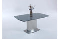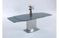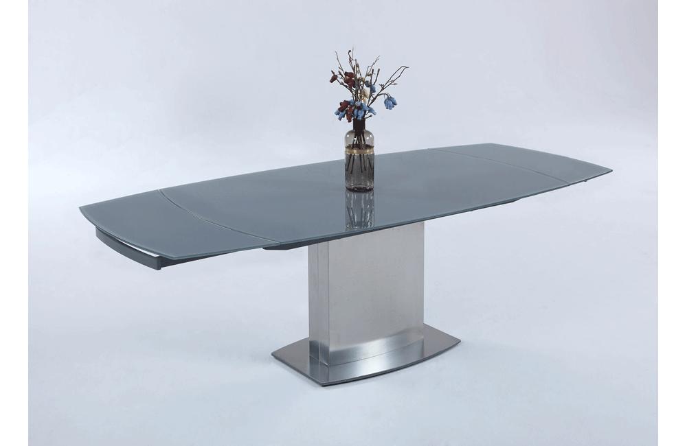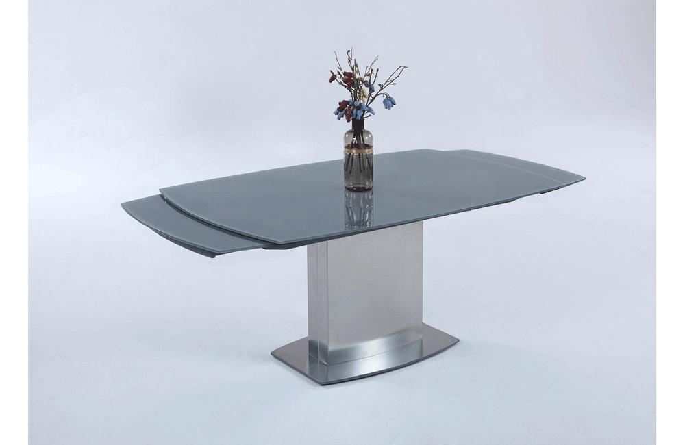 This beautiful table presents a thoroughly modern profile, featuring a gray tempered glass top and sweeping lines. Along with its self-storing extension, it's a piece both elegant and functional.
