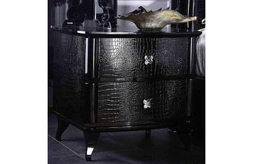 The Gothic nightstand is covered with a detailed laser-cut crocodile texture and glossed with a black lacquer. This mysterious design also features four saber styled black gloss legs, two drawers and stainless steel decorative handles.
