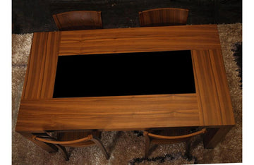 Gregorios Dining Table- Wood veneer on medium density fiberboard. Black glass accent on tabletop. Thick block legs provide reassuring support to the thick table top with black glass insert.