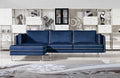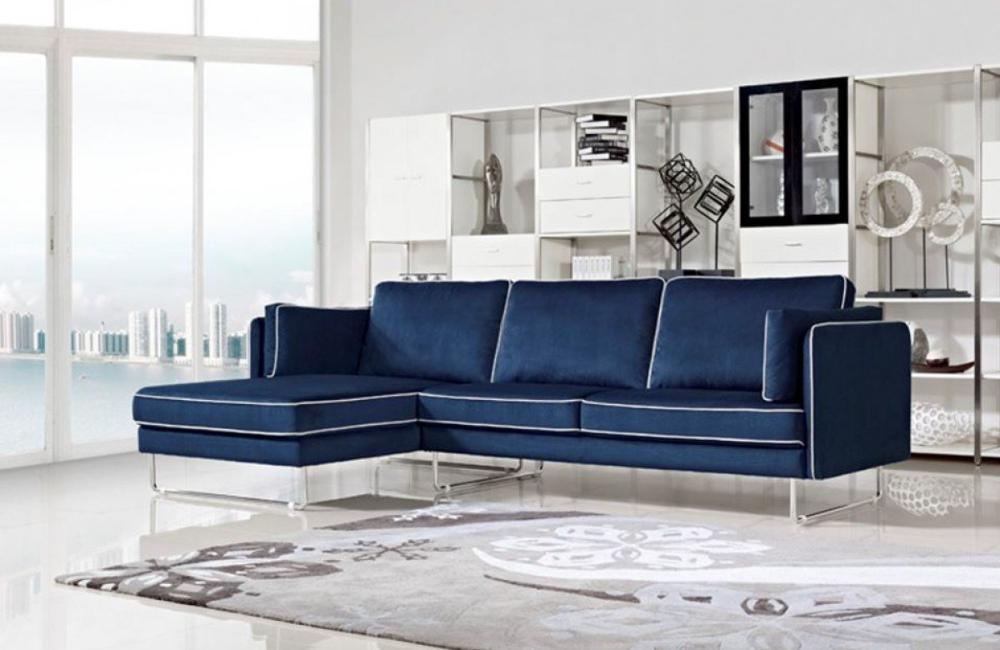 The body of the Anchusa Sectional is upholstered in a richly saturated blue 100% polyester knitting jacquard fabric and white piping trims the edges to create a striking contrast. Sturdy yet slender stainless steel legs mimic the rounded edges of the Anchusa to balance the composition. A left facing chaise is included for additional leg room. Accessorize with silvers and whites or use complementary colors to make the Anchusa pop in your living room.