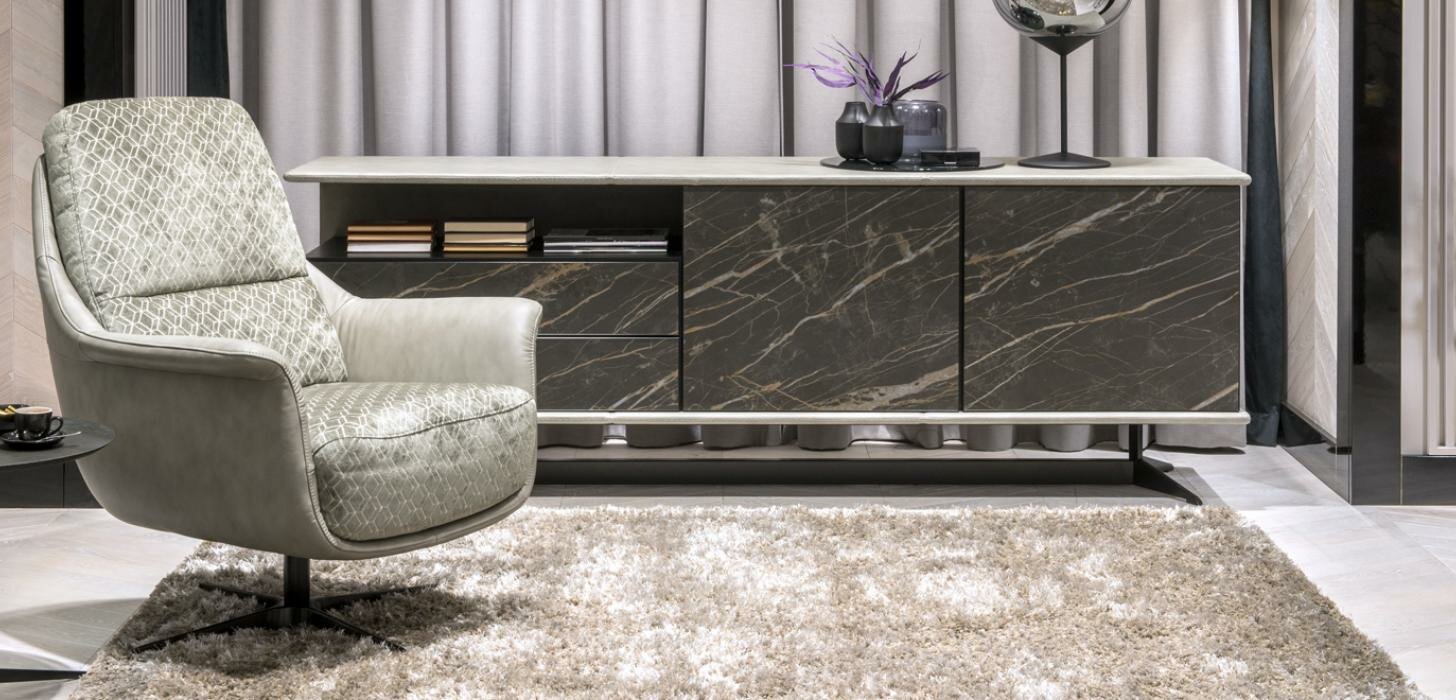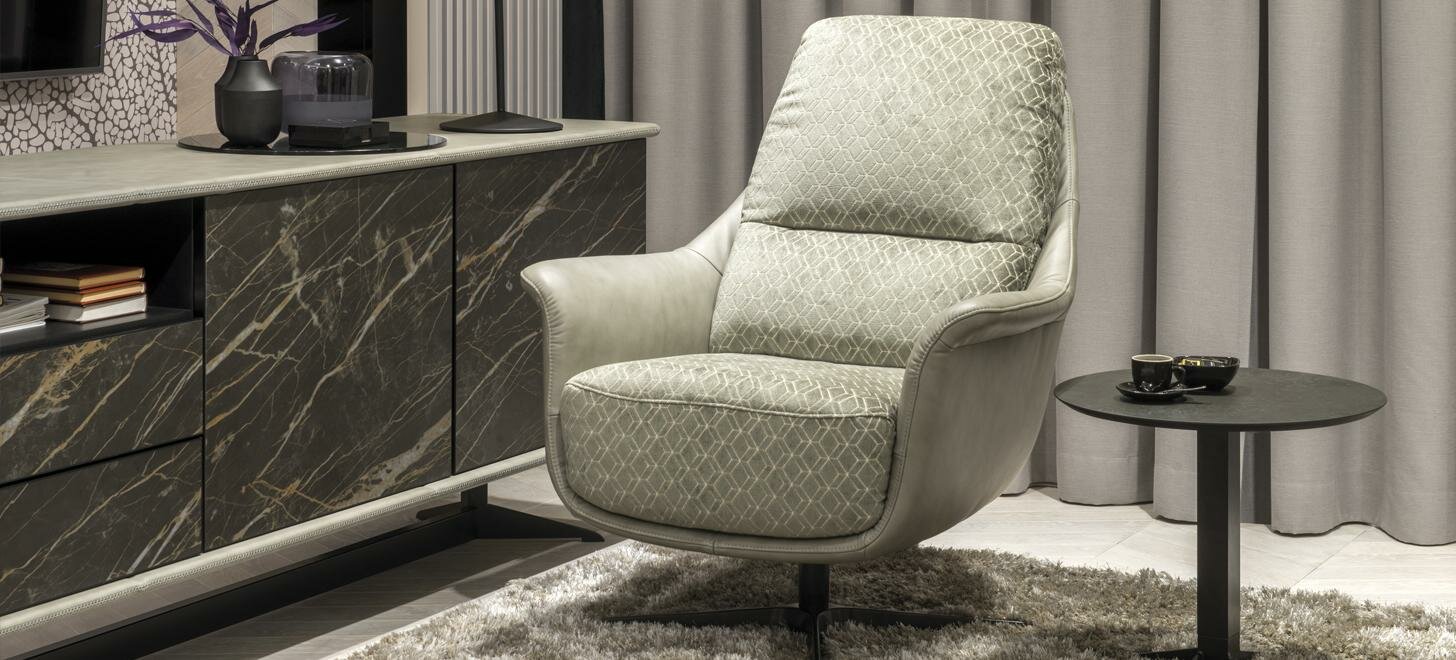 The Nordholtz Hagen armchair boasts unique, slightly rolled armrests that offer optimal support and comfort. Its comfortable seat and backrest, combined with a metal, swivel leg in the shape of a cross for a sleek, modern look, make it a perfect addition to any room in your home or workplace. Available in a choice of burgundy leather, black fabric, or green fabric upholstery options and supported by a black aluminum leg, this armchair is designed with the user's comfort in mind. Customization options for the upholstery material, color scheme, and leg staining are also available upon request.