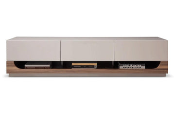 Gorgeously crafted in a taupe high gloss, with contrasting walnut veneer the Harley TV Base is simple, sophisticated, & Sleek. This TV unit also Features a shelf with an attractive arch design for media devices, and 3 deep drawers with soft closing for plenty of storage.