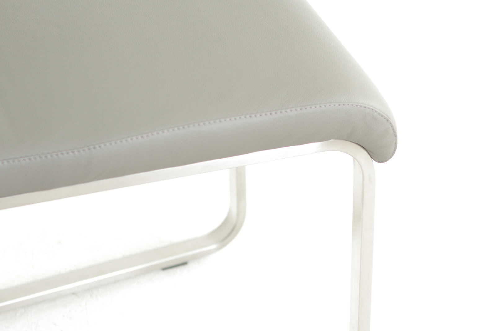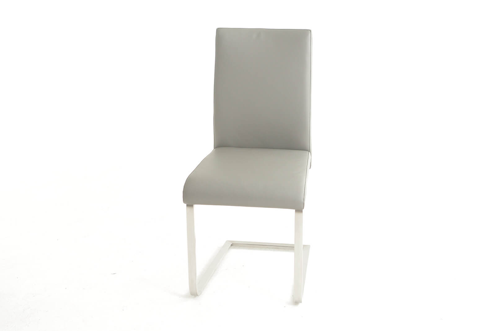 Havel dining chair is extremely comfortable . Upholstered in 100% top grain gray leather all around with stainless steel c-shape base.
