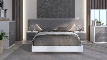 Heike Bedroom is crafted from the highest quality materials. We use hand-selected woods, wood veneers and natural lacquers as well as the finest German hardware by Blum. There is no doubt that, Heike is one of the finest bedrooms yet. Long headboard consists of geometric shapes including LED lights which create a unique design and ambient atmosphere. Heike Bedroom offers wide range of items including Queen and King size beds, nightstands, dressers, mirrors and chest.