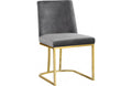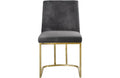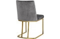 Lend your dining room a Hollywood-inspired vibe with this chic Henrique Grey Velvet Dining Chair. This pretty chair features velvety smooth upholstery on its back and seat cushions to comfort and pamper guests while they enjoy their meals. The pink color lends the chair a touch of cheery feminine panache and ensures that you make a big statement in your space. The metal frame has a polished gold finish that adds to the lavish look of this armless chair.