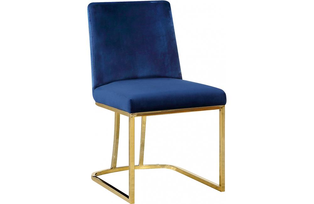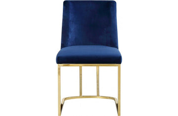 Lend your dining room a Hollywood-inspired vibe with this chic Henrique Navy Velvet Dining Chair. This pretty chair features velvety smooth upholstery on its back and seat cushions to comfort and pamper guests while they enjoy their meals. The pink color lends the chair a touch of cheery feminine panache and ensures that you make a big statement in your space. The metal frame has a polished gold finish that adds to the lavish look of this armless chair.