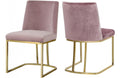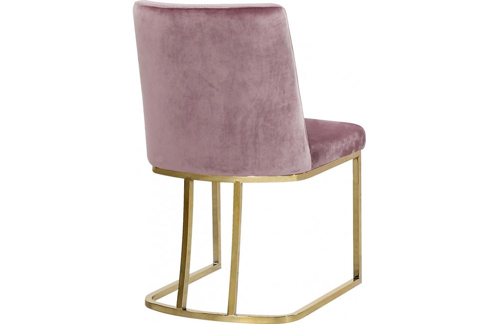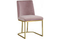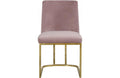 Lend your dining room a Hollywood-inspired vibe with this chic Henrique Pink Velvet Dining Chair. This pretty chair features velvety smooth upholstery on its back and seat cushions to comfort and pamper guests while they enjoy their meals. The pink color lends the chair a touch of cheery feminine panache and ensures that you make a big statement in your space. The metal frame has a polished gold finish that adds to the lavish look of this armless chair.
