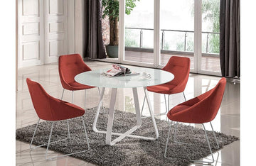 Casa Eleganza is proud to introduce the Holly modern dining collection.This dining collection features an optic white glass top paired with uniquely shaped white metal legs for a luxurious look. The table is contrasted by modern chairs which are upholstered in a pumpkin fabric for bold contrast.